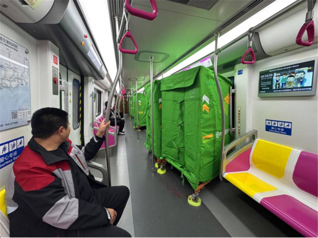 8号线轨道物流运输专用车厢位于列车头部首节车厢,车厢中部的笼车纵向按列整齐排布,通过特殊固定装置牢牢锁止,确保列车行驶过程中笼车不会移位摇晃,提升运输安全。同时,在专用车厢与第二节车厢连接处设置专用装置隔离,实现客货空间分离,既保障了物流作业的高效运转,又为乘客营造出更加整洁舒适的乘车环境。
